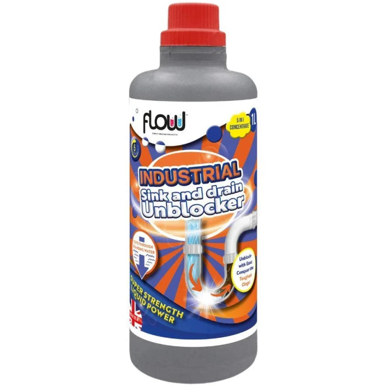 Flow Industrial Sink and Drain Unblocker Liquid 1 Litre drain away indoor and outdoor drain unblocker with a new strong fast acting formulation.